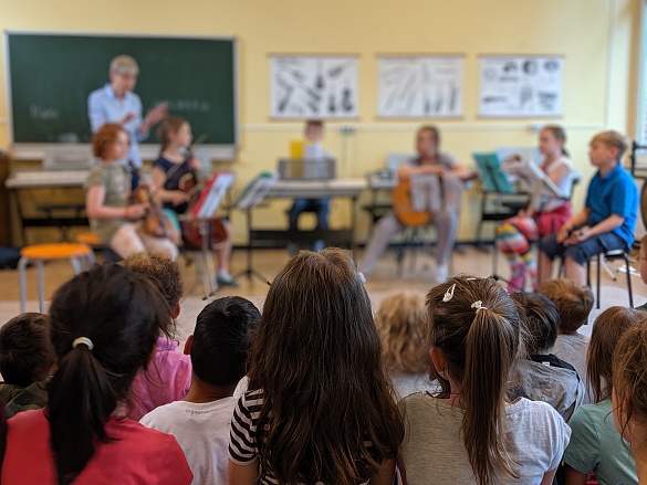 Am 13. und 14. Juni waren unsere Gerade-noch-ErstklässlerInnen in den Musikraum eingeladen. Einige Kinder aus der vierten Klasse haben ihnen dann etwas auf ihren Instrumenten vorgespielt und danach konnten alle Kinder jedes der fünf Instrumente ausprobieren! Viele der Kinder sind nun hochmotiviert, ein Instrument zu erlernen.