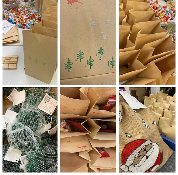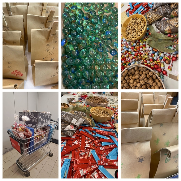 Die bunten Murmeln kommen selbstverständlich vom Schulverein selbst, genauso wieder die (nachhaltigen) Papiertüten und die Holz-Klammern. Die rund 300 (!) Nikolaustüten wurden dieses Jahr per Hand (!) mit weihnachtlichen Motiven gestempelt (das machte zwei extra Abende für einige Schulvereinsmitglieder), damit Sie so hübsch sein konnten, wie sie wurden. Am Nikolausvorabend trafen sich dann das Schulvereinsteam mit weiteren fleißigen Eltern heimlich in der Schule, um hier liebevoll die Nikolaustüten zu befüllen. Ja, auch alle 10 Murmeln mussten diesmal einzeln abgezählt und fein säuberlich in den Stoffsäckchen verstaut werden, samt Murmelanleitung, versteht sich... Das war richtig Arbeit! Man könnte schon fast von einer Nikolaustüten-Manufaktur sprechen! Aber pssst…nix euren Kindern verraten – natürlich mag der Nikolaus nicht so viel über seine fleißigen Helferlein preisgeben, an die hiermit nochmals ein (heimliches) DICKES DANKE raus geht.