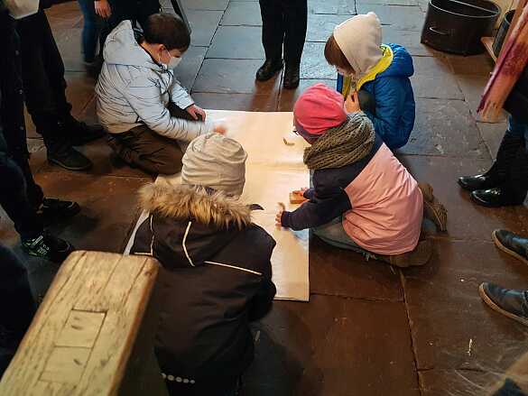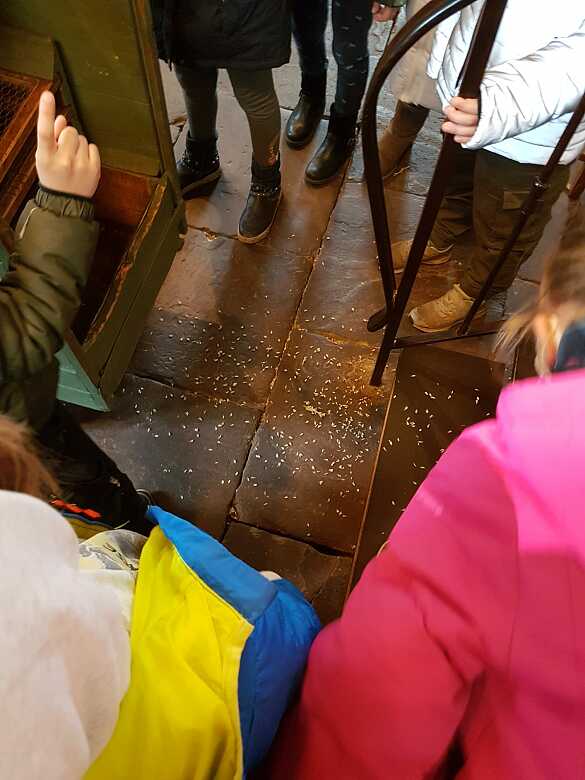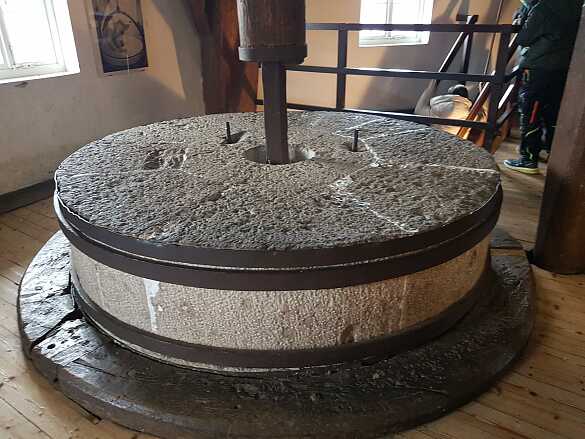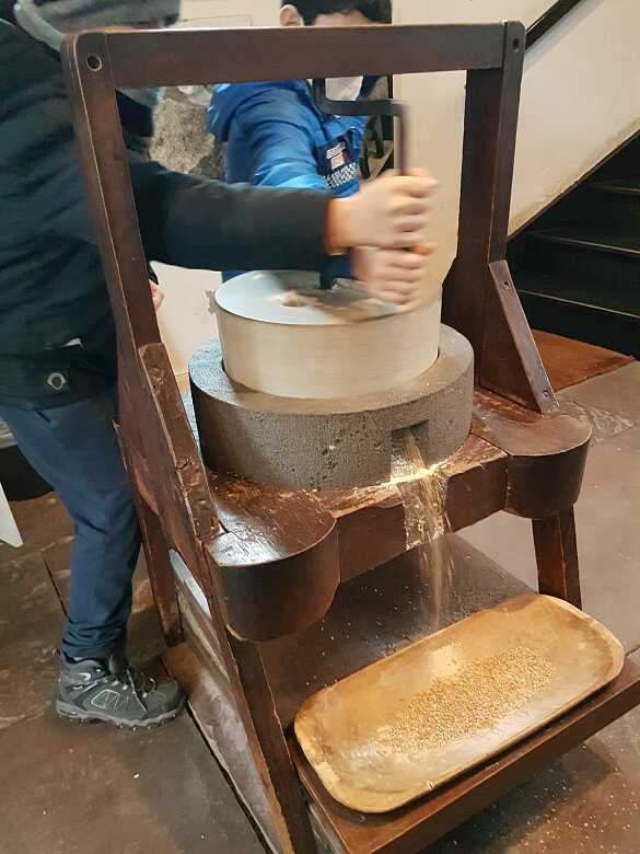 Als Klasse haben wir versucht den großen Läuferstein zu bewegen. Der wiegt aber fast 1,5 Tonnen und kann nur mit Wind angetrieben werden. Mit einer Handmühle durften wir dann selber Mehl mahlen.