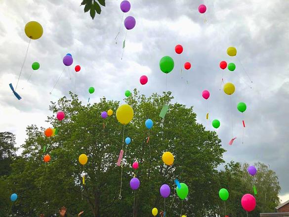Und dann...? Wie immer konnten die Kinder zu den Klängen von "Wir sagen euch Tschüss" von der Bühne springen und durch das Spalier nach draußen laufen, wo Luftballons mit guten Wünschen auf die Reise geschickt wurden. Macht's gut, ihr Lieben. Wir werden euch vermissen!!