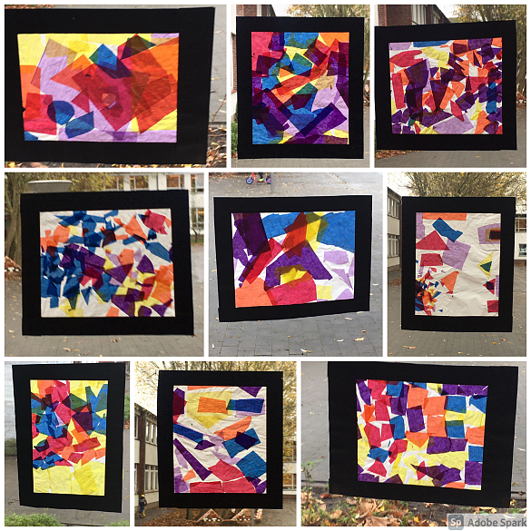 Mit bunten Formen aus Transparentpapier haben die Kinder der Klasse 1c durchscheinendes Butterbrotpapier beklebt. Der schwarze Rahmen lässt die Farben noch viel mehr leuchten. Es sind sehr schöne Fensterbilder entstanden, die unsere Aula schmücken.