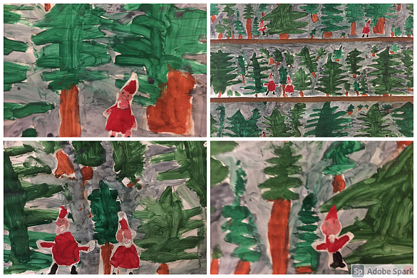 Heute haben die Kinder der 1c in einer Gruppenarbeit einen Wald mit Tannenbäumen gemalt. Und dort haben sich schon Nikoläuse versteckt, die bereits ungeduldig auf den 6. Dezember warten!