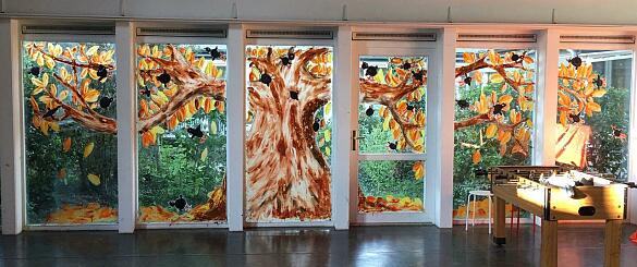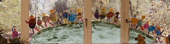 Die Klasse 1c hat ihre Fenster sehr farbenfroh dekoriert. Alle haben sich mit Wasserfarben gemalt und jetzt marschieren die wunderbaren Figuren vergnügt über die Fensterscheibe.