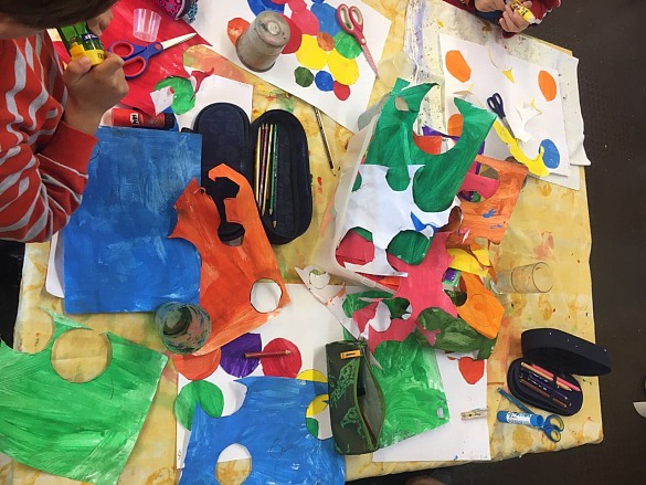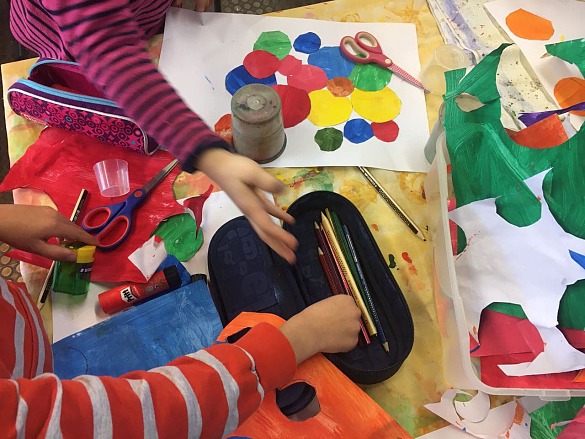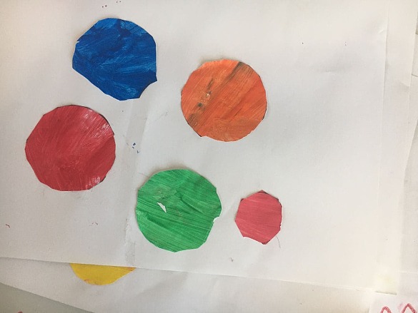 Diesmal hat die Klasse 1c nicht Kreise mit dem Pinsel ausgemalt. Die Kinder haben in einem weiterem Arbeitsgang selber farbige Papiere hergestellt und dann daraus große und kleine Kreise ausgeschnitten. Es sind wieder schöne Bilder entstanden.