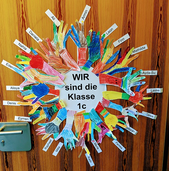 In der ersten Schulwoche haben wir unsere Klassenraumtür gestaltet. Frau Herberger hat mit uns die Konturen unserer Hände ausgeschnitten und angemalt. So um einen Kreis geklebt sehen die fast aus wie eine bunte Minisonne!