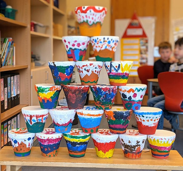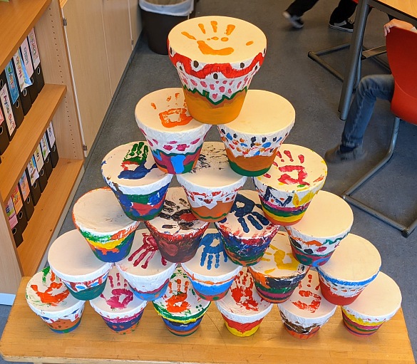 Mit Acrylfarben kann man die Trommeln dann bemalen. Sie sind wirklich wunderschön geworden und klingen fantastisch. Wir entschuldigen uns jetzt schon mal bei unseren Nachbarklassen für die lautstarken Trommelsessions...