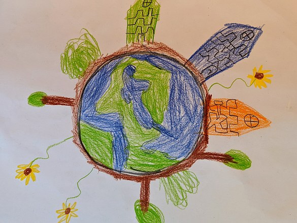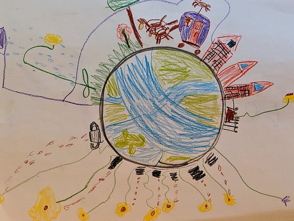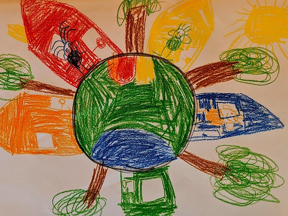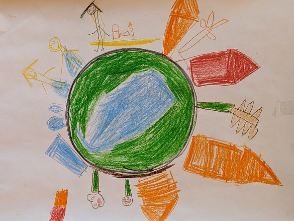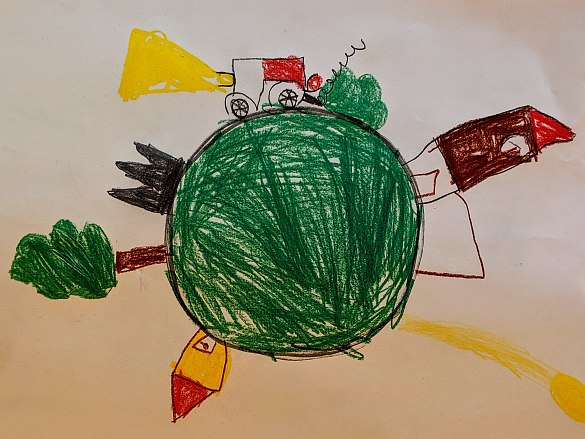 Am 6.9.2019 haben wir unsere Erdkugel gemalt. Und auf so einer kleinen Welt gibt es allerlei zu sehen: Blumen, Häuser, Menschen, Kutschen, Trecker und noch viel mehr!